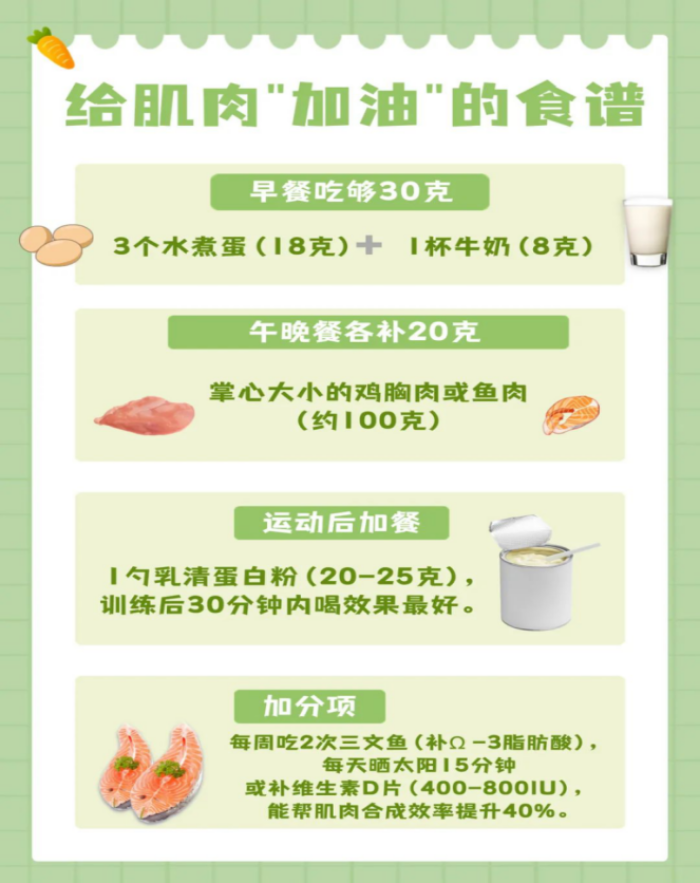 1. 吃对东西 :肌肉就像一台需要优质燃料的发动机,蛋白质是核心燃料。普通成年人建议每天摄入足够的蛋白质,即每公斤体重需1.2-1.5克(比如60公斤的人需72-90克左右)。推荐这样吃,更科学哦