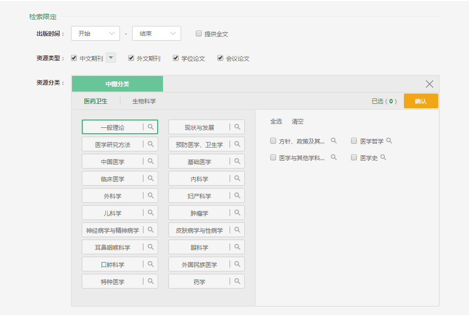 - 资源分类限定的中图分类从“医药卫生”和“生物科学”两大方面划分,用户选择多个分类进行检索。