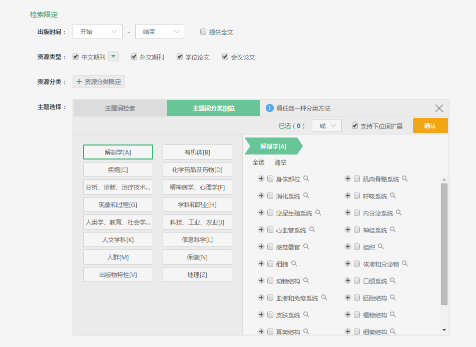 - 主题词限定支持主题词分类浏览和主题词搜索,用户同样可以选择多个主题词进行检索,并支持下位词扩展。