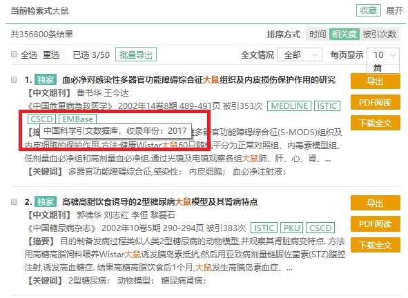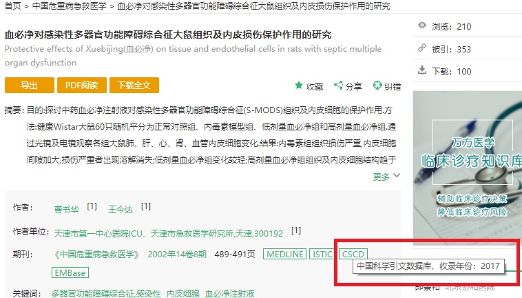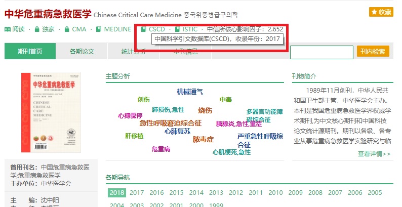 2018年,万方医学网检索发现系统提供更为精细化的服务,在文献检索结果列表、期刊首页、文献详情页,鼠标悬停显示收录源收录年份。在期刊首页显示ISTIC核心期刊影响因子。