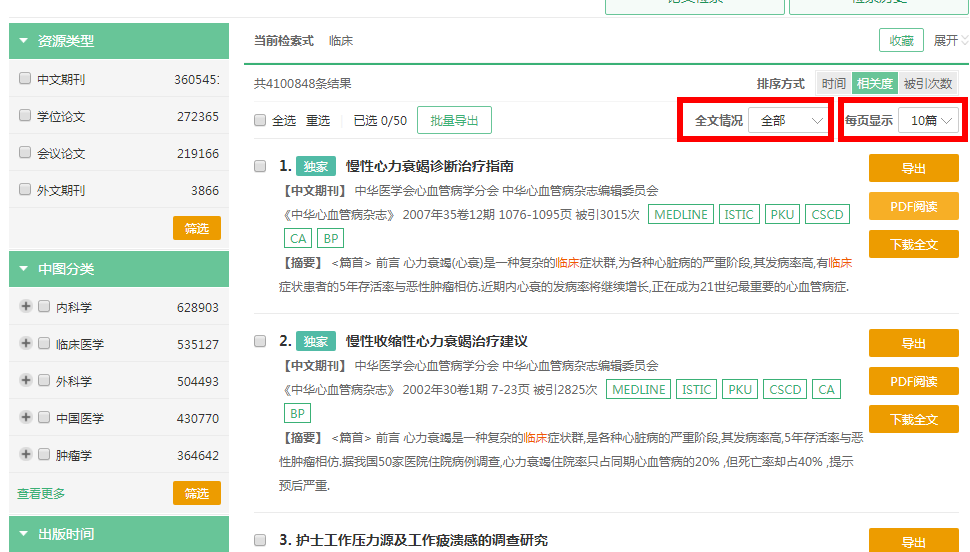 - 资源类型:包括中文期刊、外文期刊、学位论文和会议论文。其中,中文期刊分为全部中文期刊,独家中文期刊,中华医学会期刊,还特别添加了核心期刊。