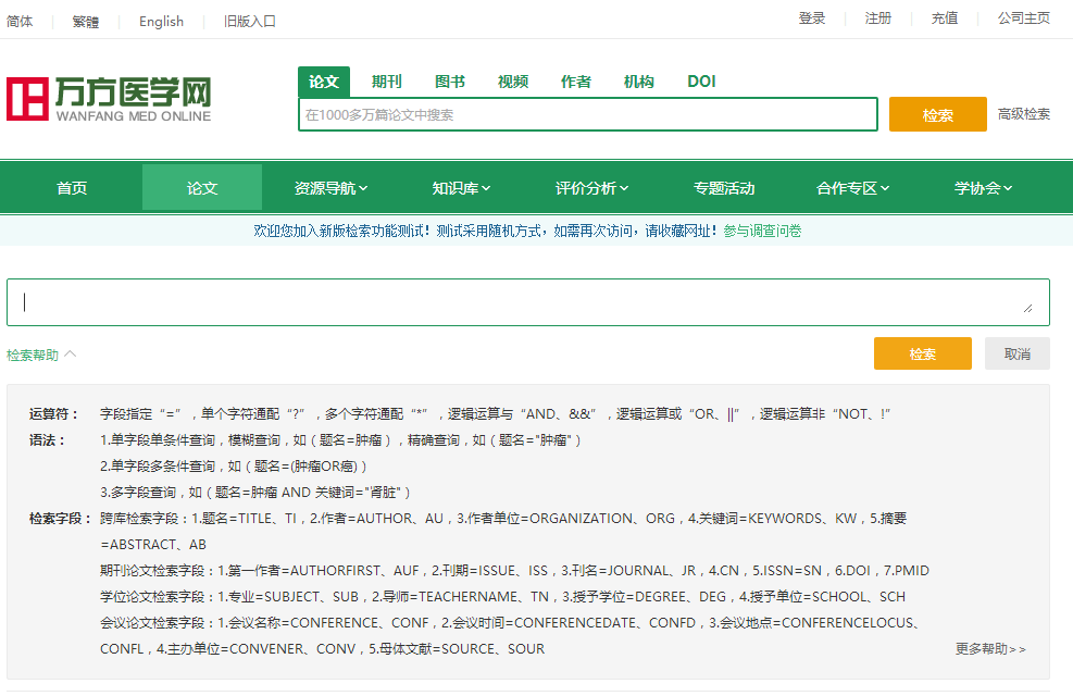 检索表达式通过支持逻辑运算符使检索条件多样化,在最大化满足用户搜索需求的同时进行更严谨的文献检索。此外,万方医学网还提供专业检索语法说明,方便用户精准检索。